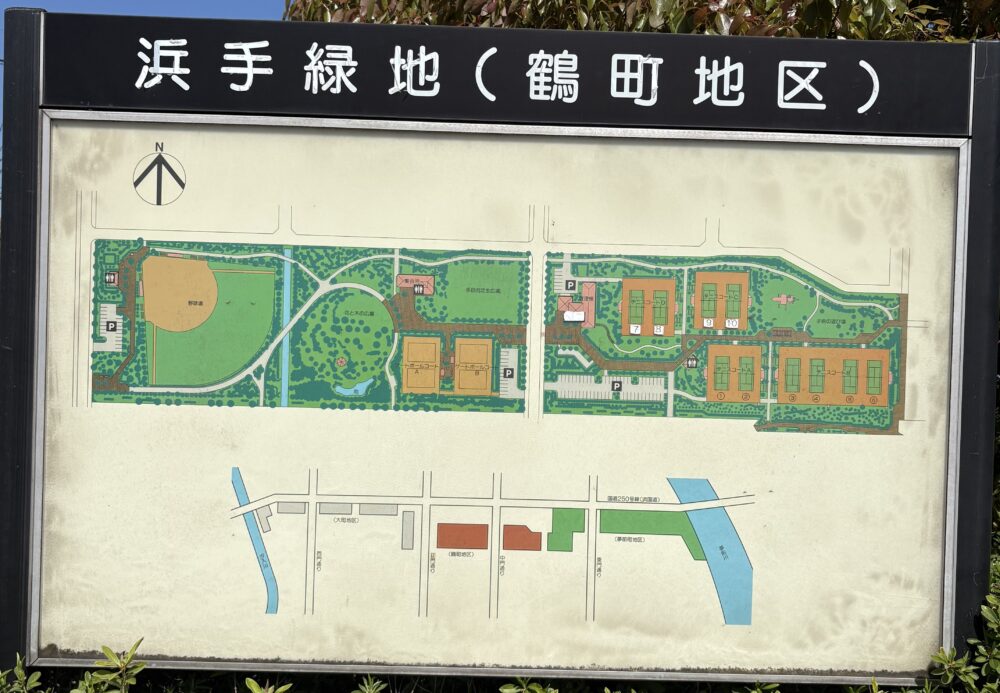 上の写真を見ていただくとわかりますが、浜手緑地(鶴町地区)は広く敷地は木で囲っているような状態なので外からは公園の全貌が見えないです。