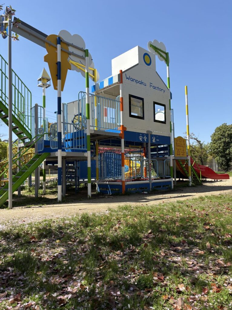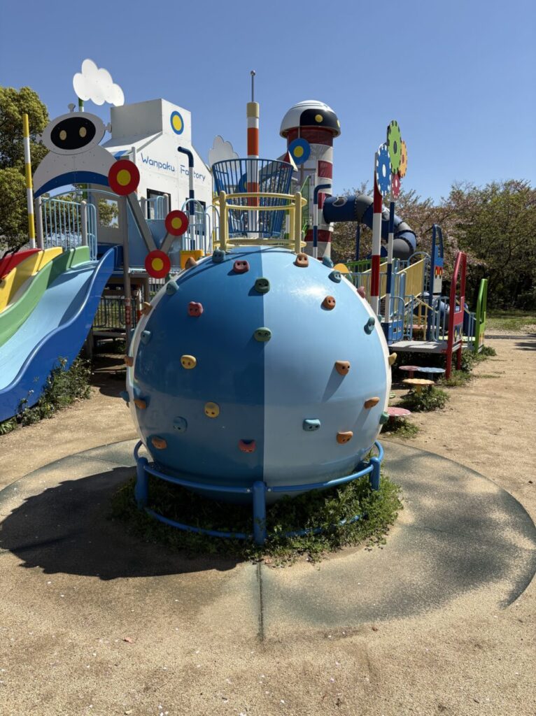 遊具のど真ん中に、工場の標語みたいな青い文字で『安全第一』って書いてあるんです!これ、他の公園では見たことありません(笑)。