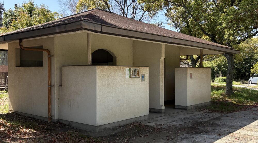 テニスコートの駐車場から巨大遊具がある途中にトイレがあります。おむつ交換台は見つからなかったです。写真を見ていただくとお気付きかと思いますが、かなり年期は……