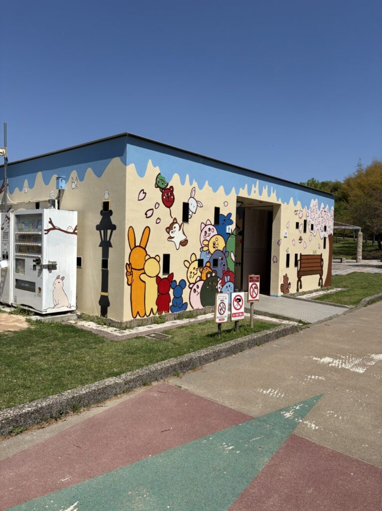 トイレは駐車場側と遊具側の2か所。おむつ交換台も完備しており。トイレ全体的に綺麗です。写真のようにかわいい絵がかいている建物が目印です。