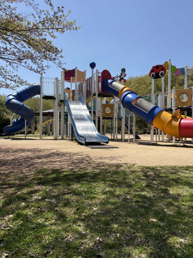 そのままでも滑れはしますが、土手遊びとかで使うジュニアプレイボード等持っていくとより楽しめますよ!子の滑り台と遊具の間には綺麗に整備されている庭みたいになっていてそこには屋根付きベンチや巨大なテーブルがあり、ピクニックにはめちゃくちゃおすすめです!