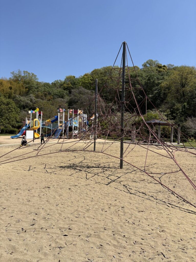 巨大遊具のすぐ横にはザイルクライミングが2つ並んでいて、ザイルクライミングがある場所は全部砂場になっています。なので砂場の広さはかなり大きく思いっきり砂遊びができます。写真は平日に撮ったものですが、日曜日に子供と遊びに行ったらレジャーシートを持ってきたり、テントを持ってきたりと子供連れ家族でかなり賑わっていました。