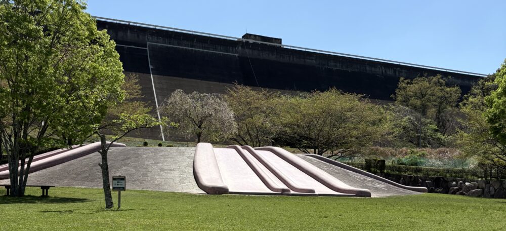 巨大遊具からさらに奥(ダム側)に行くと園路があり一番奥には3方に広がる滑り台があります。