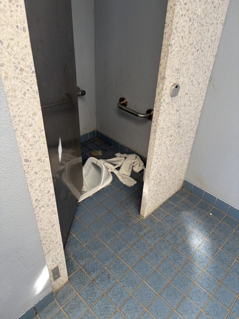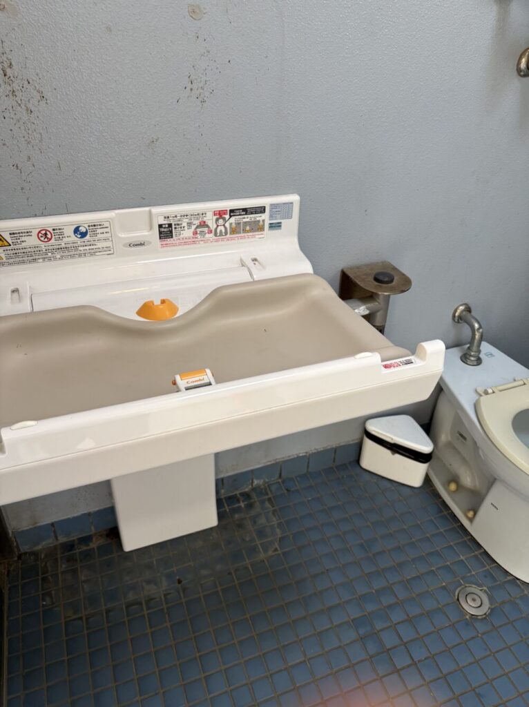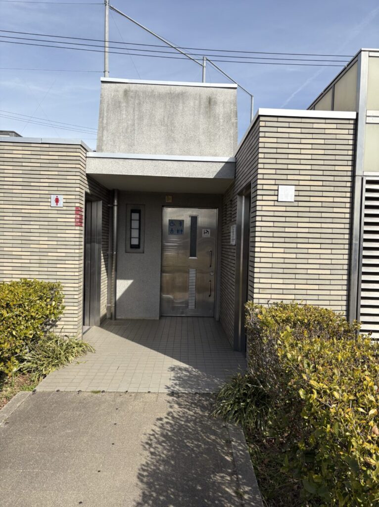 公園と公園から一番近い駐車場(野球場西駐車場)の間に設置されています。トイレ・お持つ交換台があるのはうれしいですが、私が遊びに行った時はとてもきれいだと言えない状態でした。トイレ設備も私がほかに紹介した公園と比べて古いし、正直に言うと使いたいとは思えないトイレでした。男子便所の小便器は一部使用不可があるそうです(2026年3月)。