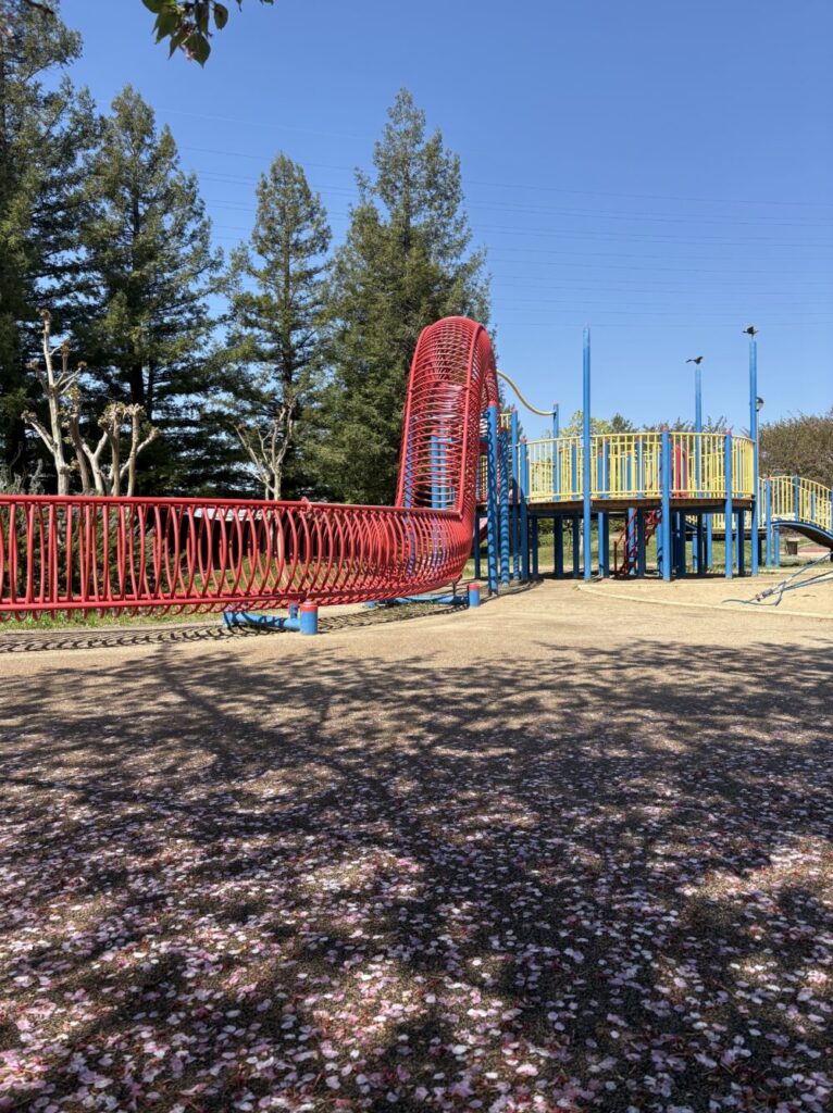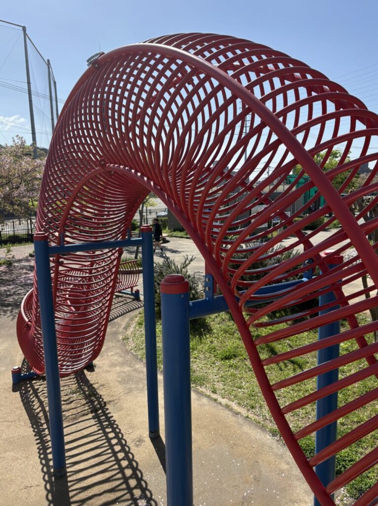 この公園の遊具は一際目立つ赤色の長いリングトンネルです。ほかの公園ではあまり見られないこともありやはりここで遊ぶ子供が多く感じられます。